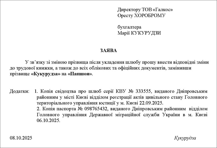 - Крок 2. Роботодавець на підставі заяви видає наказ про внесення змін до облікових документів (зміна прізвища);