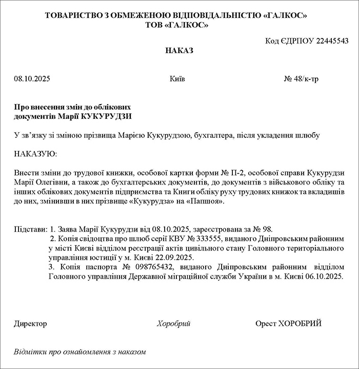 На підставі поданої заяви та підтвердних документів керівник видає наказ про внесення змін до кадрових та інших документів у зв’язку зі зміною прізвища працівниці.