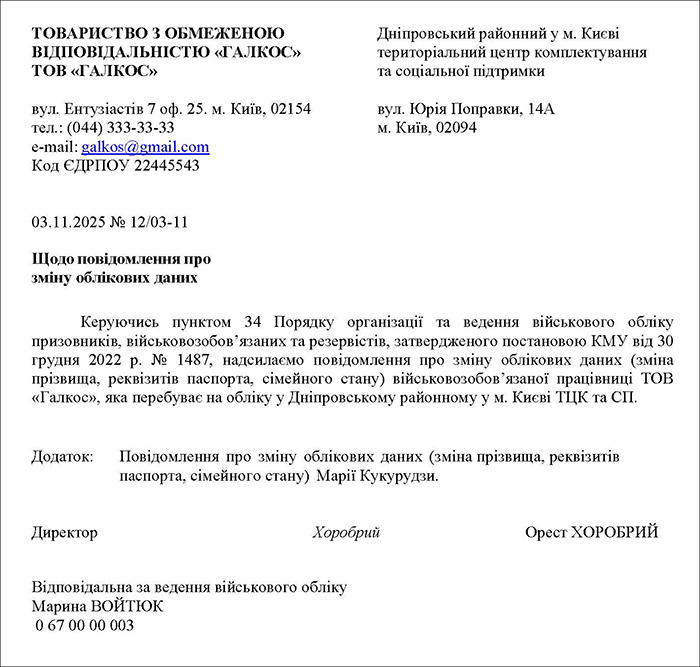 Повідомлення за Додатком 4 до Порядку №1487 слід надіслати до ТЦК, оскільки у працівниці відбулася зміна облікових даних – прізвища, реквізитів паспорта та сімейного стану. Це обов’язкова вимога: усі зміни потрібно своєчасно фіксувати та повідомляти про них ТЦК у встановленому порядку (за формою додатку 4 до Порядку №1487).
