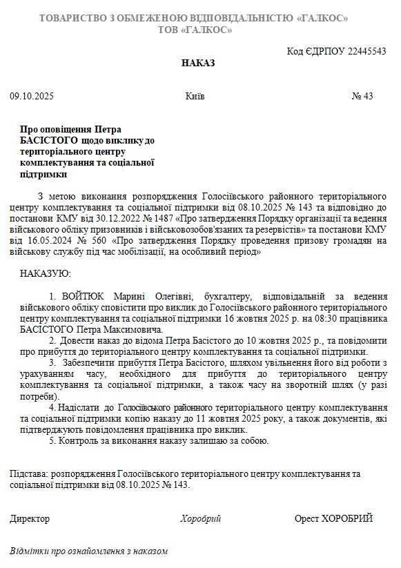 - Крок 3. Керівник підприємства видає наказ про оповіщення зазначених у розпорядженні ТЦК осіб.