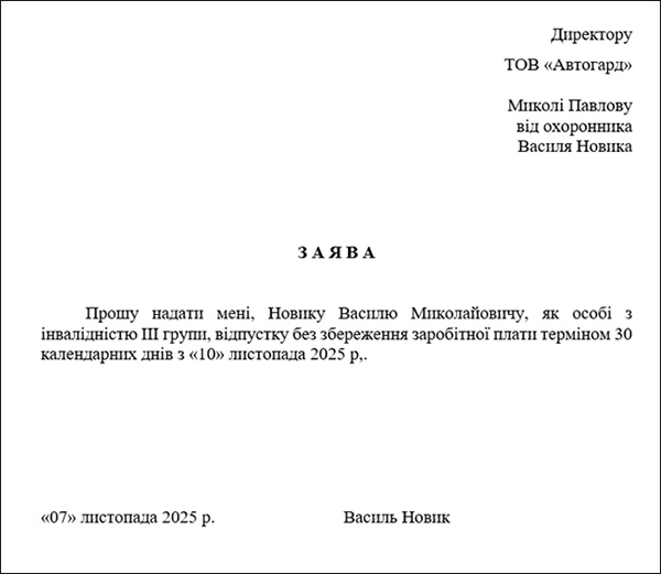 Зразок Заяви про надання відпустки без збереження заробітної плати (Завантажити >>)