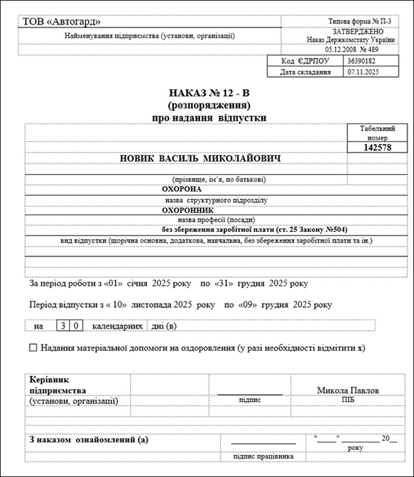 Зразок Наказу про надання відпустки без збереження заробітної плати (Завантажити >>)