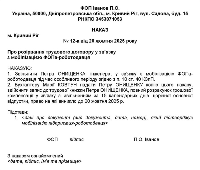 - у разі призову, вступу ФОПа-роботодавця на військову службу чи направлення його на альтернативну (невійськову) службу (п. 3 ч. 1 ст. 36 КЗпП);