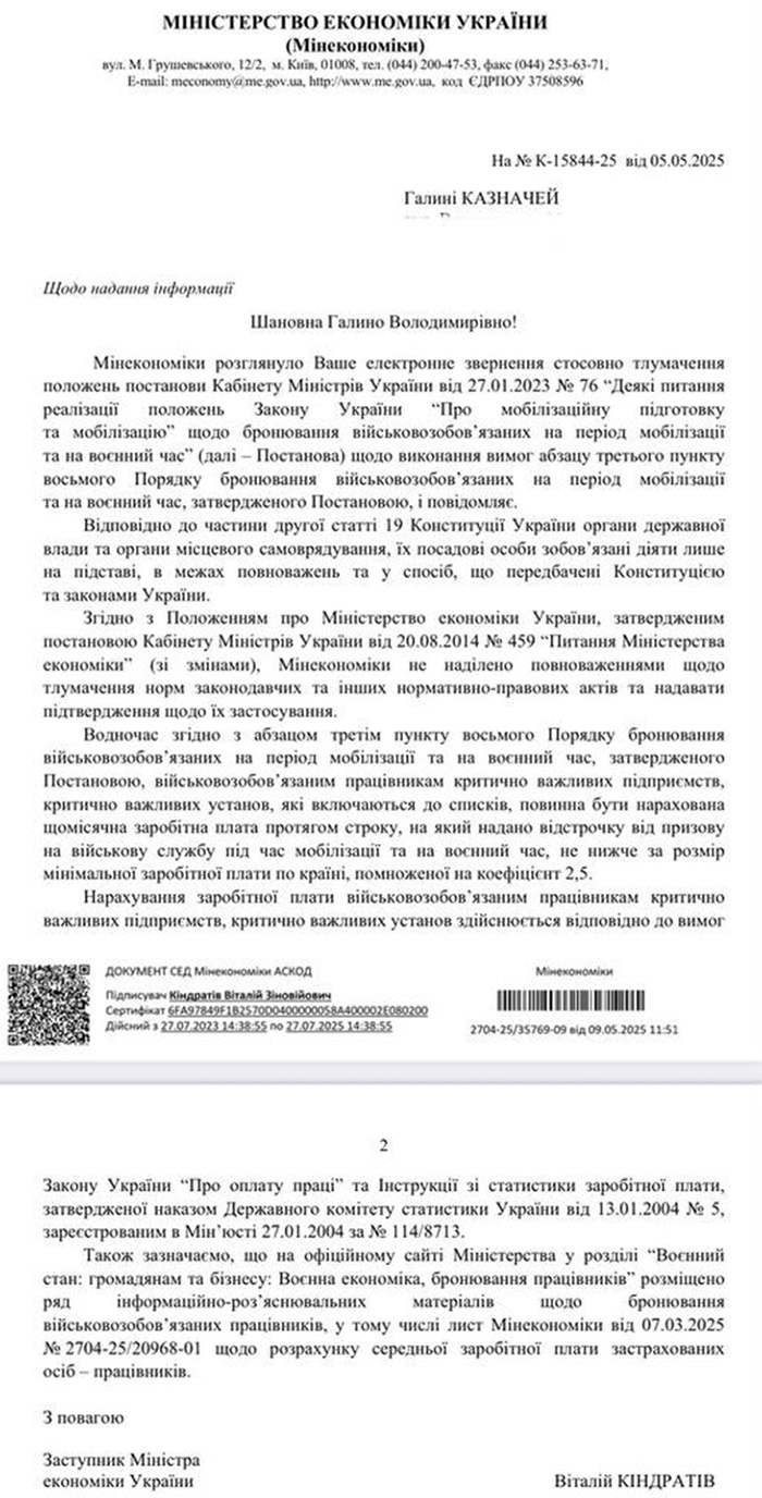 Це не нова позиція: про Інструкцію №5 та нарахування зарплати працівникам фахівці Мінекономіки також зазначали у листі від 09.05.2025 №2704-25/35769-09 (див. нижче).