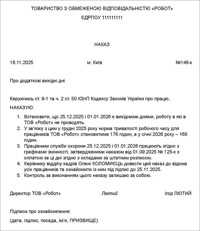 - якщо дехто все ж таки працює (наприклад, охорона), то треба описати їх режим роботи і те, як їм компенсуватиметься робота в такий день (якщо буде).