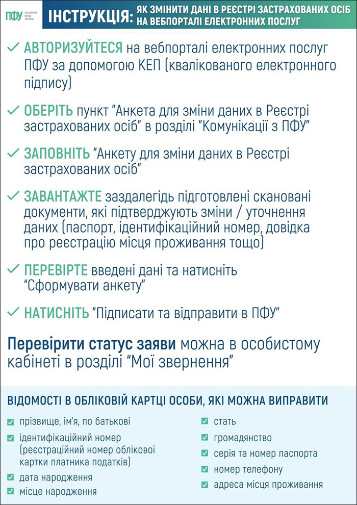 Якщо виявлено некоректні відомості в персональних даних в особистому кабінеті, застраховані особи мають можливість подати до Пенсійного фонду України анкету для внесення/зміни/уточнення даних у Реєстрі застрахованих осіб.