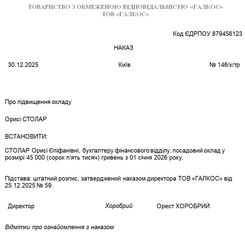 | Штатний розпис затверджено безпосередньо(окремий наказ не видається) | ЗАТВЕРДЖУЮ Директор ТОВ «ГАЛКОС» Орест Хоробрий___ __________ 2026 р. |