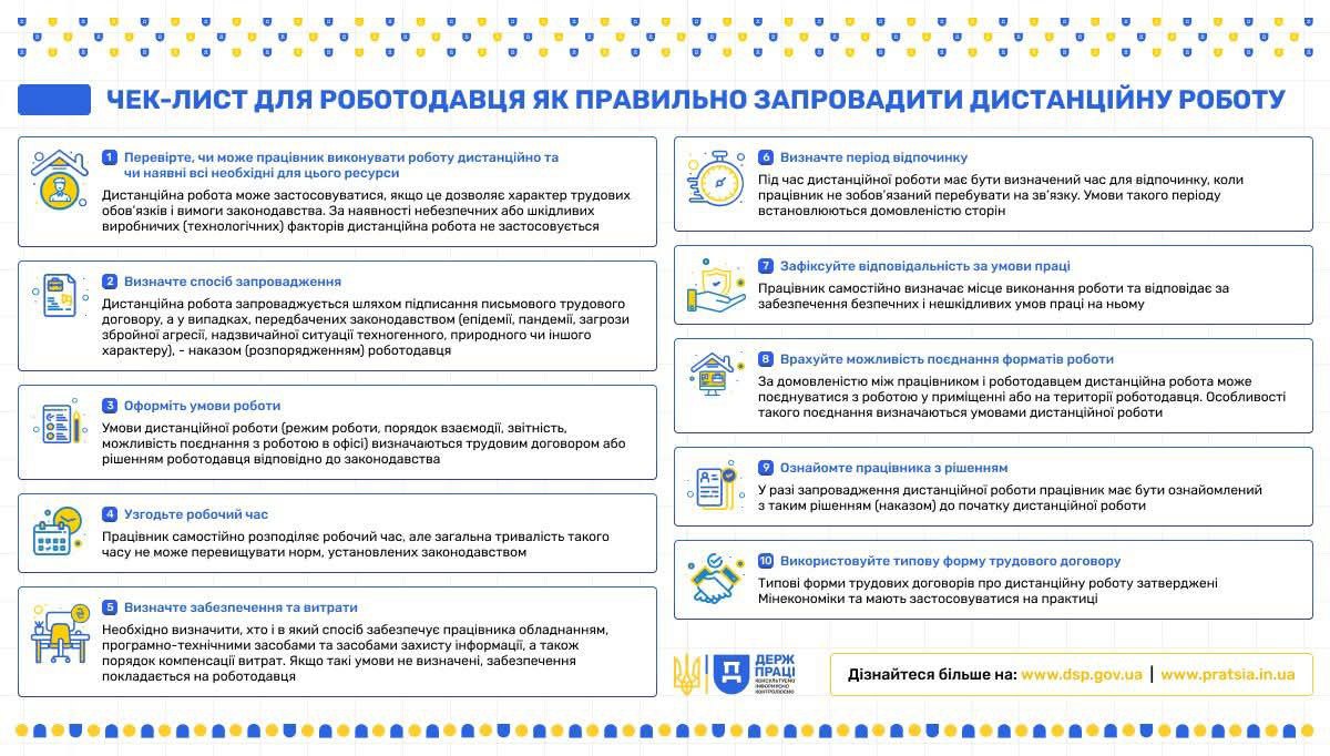- дистанційна робота можлива за домовленістю сторін або за рішенням роботодавця;