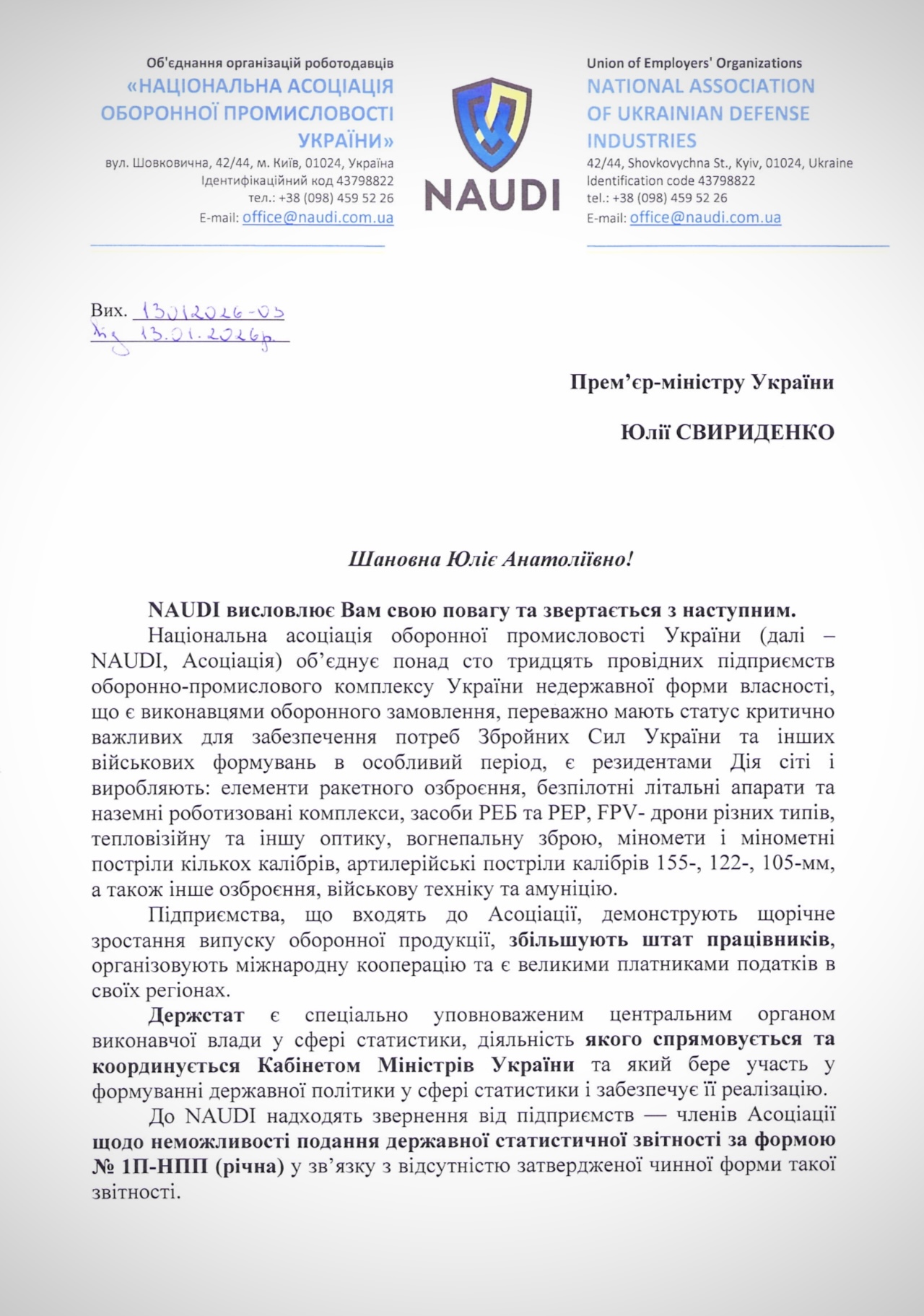 National Association of Ukrainian Defense Industries / NAUDI звернулася до Прем’єр-міністра України Юлії Свириденко з проханням терміново доручити Державній службі статистики затвердити та оприлюднити нову форму державної статистичної звітності №1П-НПП (річна) для підприємств оборонно-промислового комплексу. Йдеться про критично важливий елемент державного регулювання, від якого напряму залежить можливість оборонних виробників підтвердити свій статус та забезпечити бронювання ключових працівників.