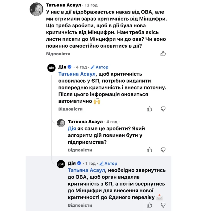 - Після того, як ОВА видалить стару критичність, потрібно звернутися до міністерства (залежно від того, хто надав нову критичність), щоб вони внесли підприємство до Єдиного переліку вже на підставі нового рішення.
