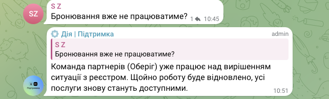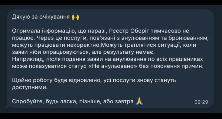 Команда партнерів (Оберіг) уже працює над вирішенням ситуації з реєстром. Щойно роботу буде відновлено, усі послуги знову стануть доступними.