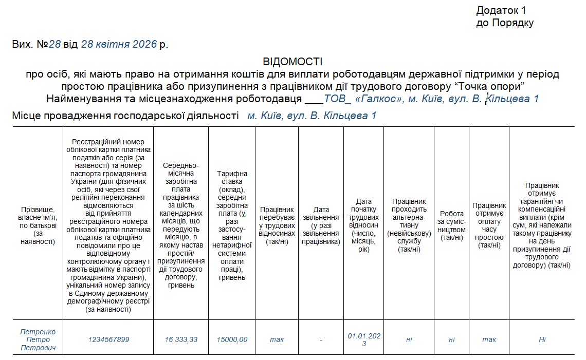 Зразок 1. Відомості про осіб, які мають право на отримання допомоги