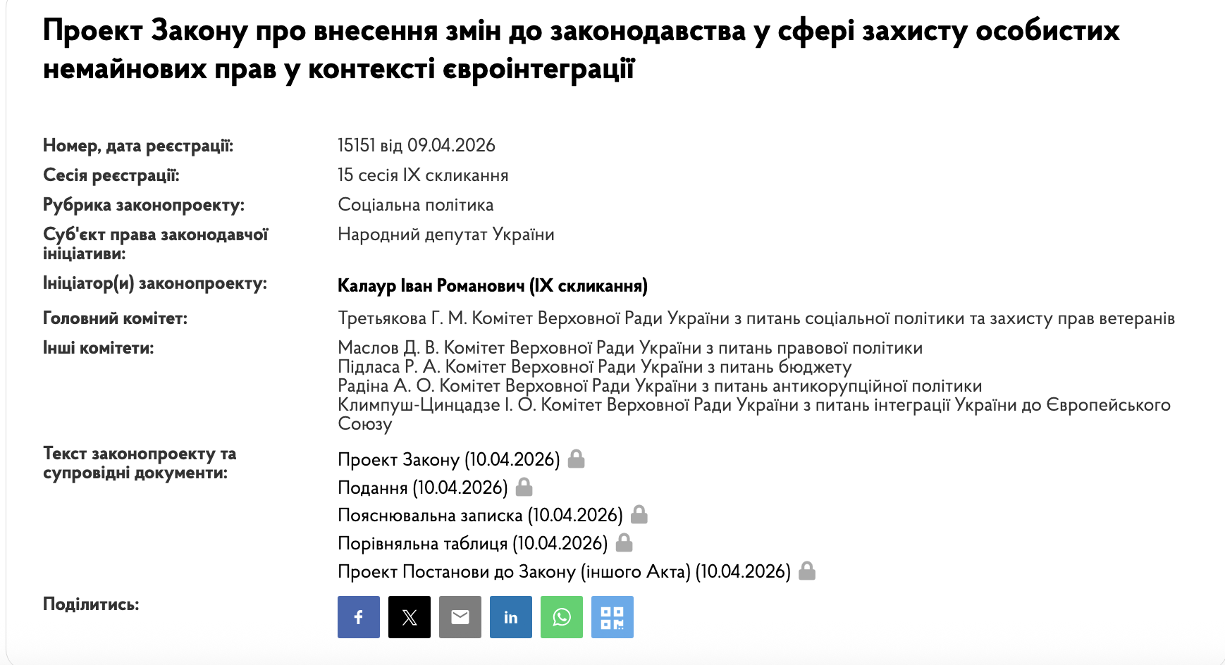 9 квітня 2026 року у ВРУ зареєстровано законопроєкт №15151 "Про внесення змін до законодавства у сфері захисту особистих немайнових прав у контексті євроінтеграції". Автором є заступник голови Комітету Верховної Ради України з питань правової політики І. Калаур.