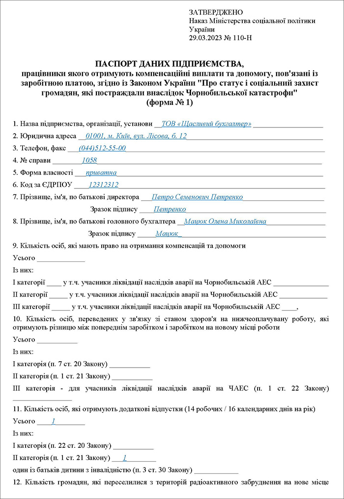 - Паспорт даних підприємства за формою №1 (затверджена Наказом №110-Н).