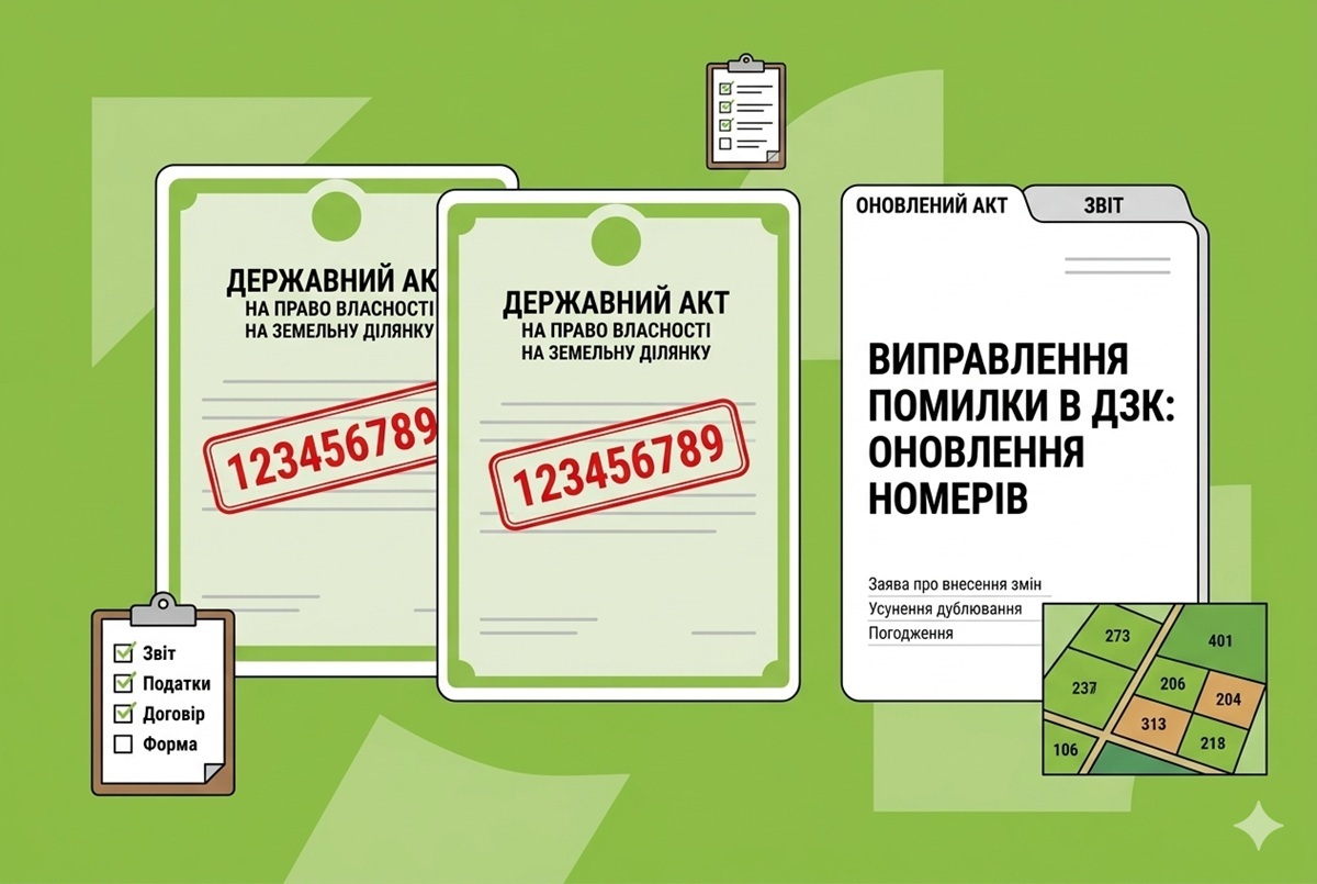 Потім - до державного реєстратора для проведення державної реєстрації права власності на підставі державного акта на право власності на земельну ділянку, що містить помилковий кадастровий номер. При цьому обов’язково необхідно надати підтверджувальні документи, які отримано в ДЗК, про те, що в державному акті міститься помилка і який кадастровий номер присвоєно земельній ділянці на заміну помилкового.