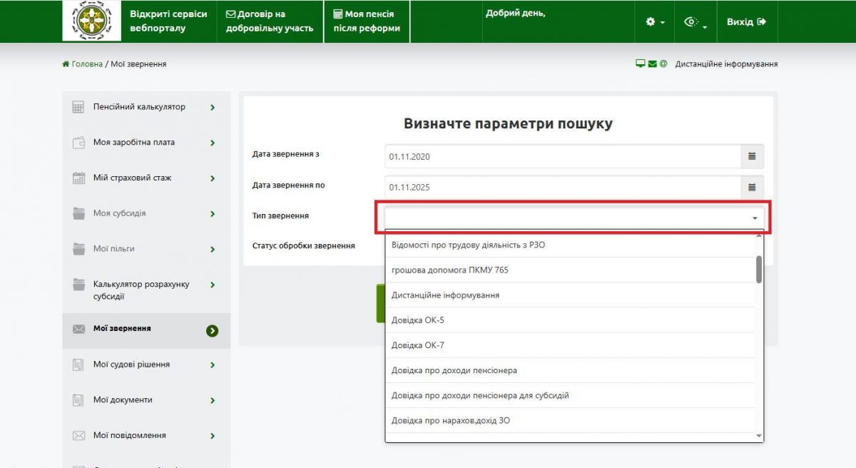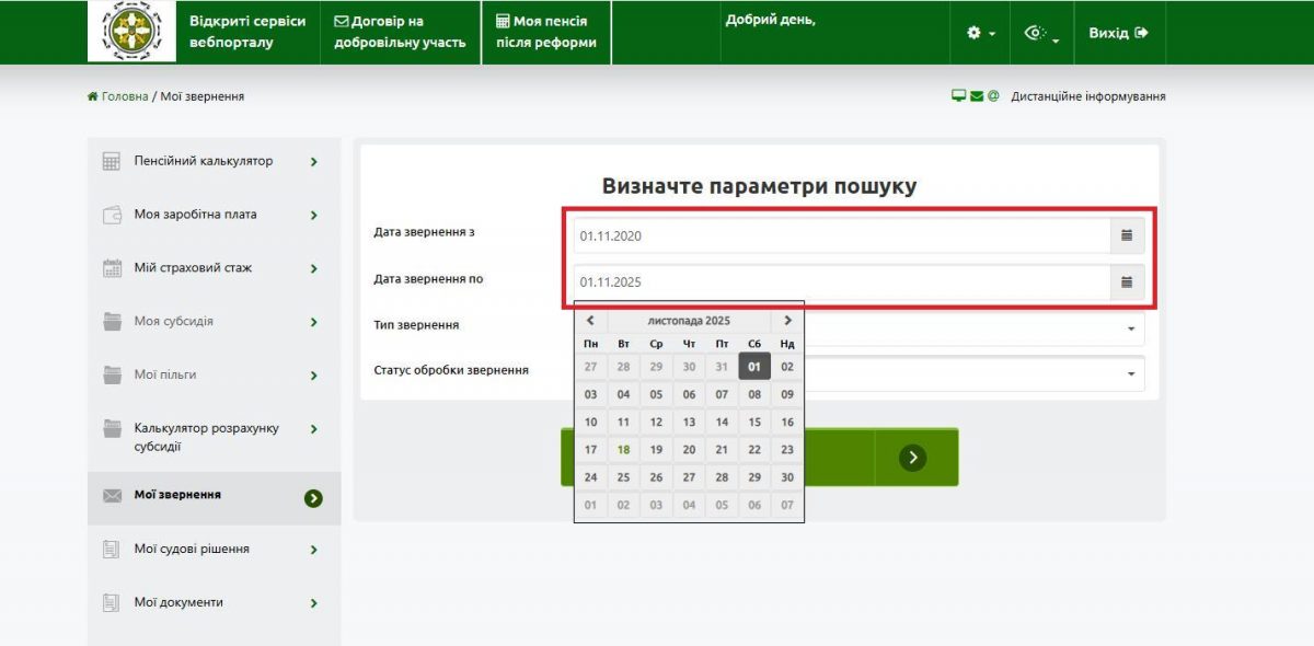 Щоб здійснити пошук всіх наявних у користувача звернень до органів Пенсійного фонду України, під час формування пошукового запиту потрібно вказати максимальний часовий параметр та залишити порожніми поля фільтра “Тип звернення” і “Статус обробки звернення”.