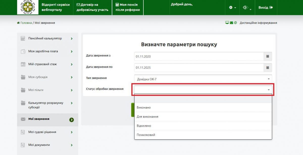 - оберіть статус обробки звернення, за яким бажаєте здійснити пошук;