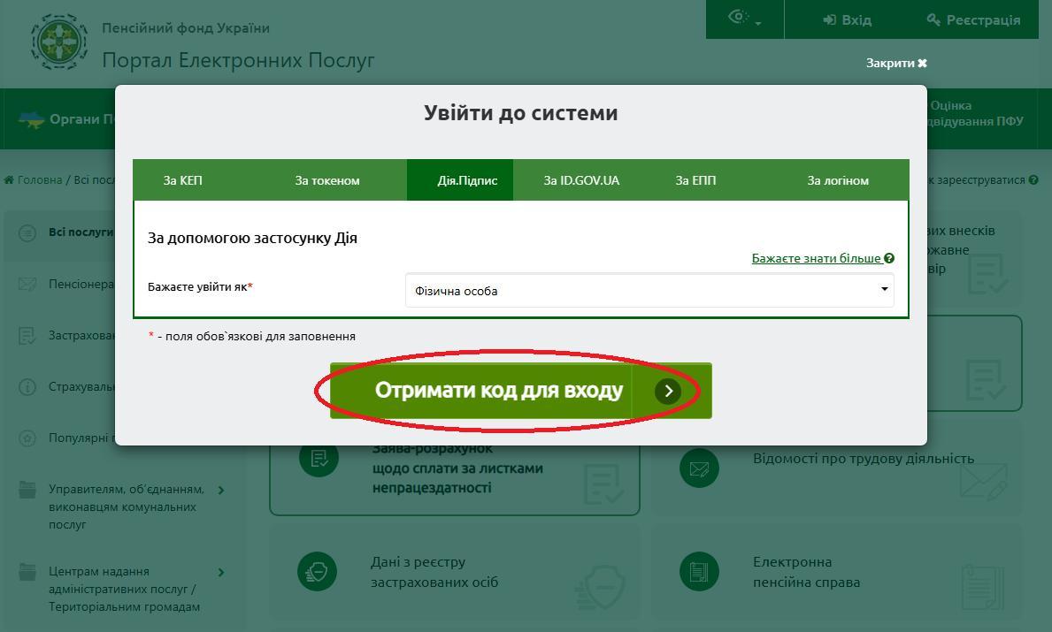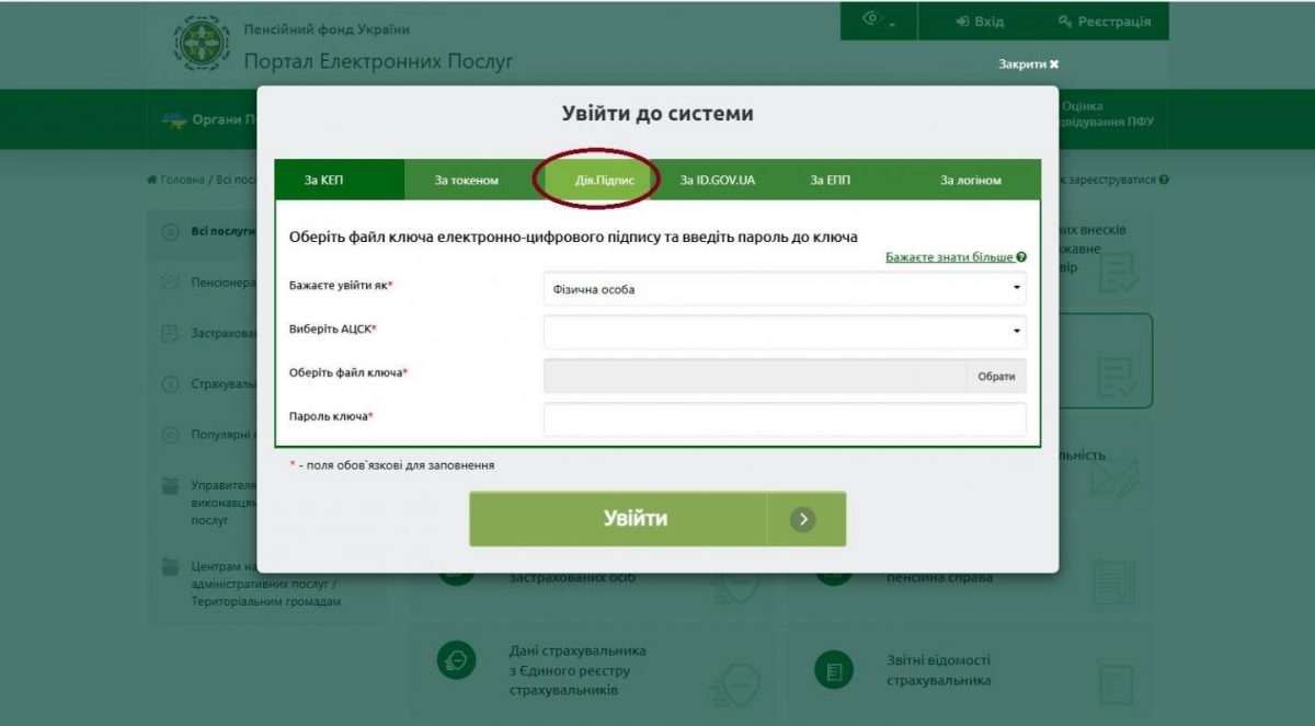 1. Зайдіть на вебпортал електронних послуг Пенсійного фонду України на комп’ютері (ноутбуці чи планшеті). У правому верхньому куті натисніть кнопку “Вхід” та оберіть опцію “Дія.Підпис”.