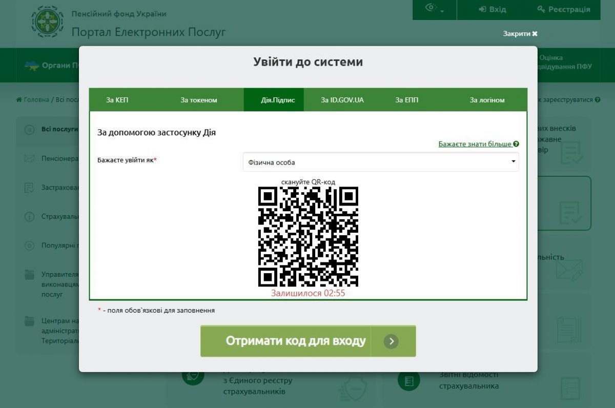 Один із найпопулярніших способів фізичної ідентифікації – авторизація в особистому електронному кабінеті на вебпорталі електронних послуг Пенсійного фонду України за допомогою віддаленого кваліфікованого електронного підпису “Дія.Підпис”, створеного за допомогою мобільного застосунку Єдиного державного вебпорталу електронних послуг.