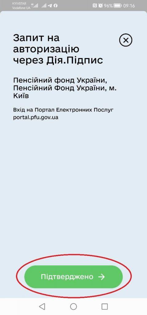 6. Якщо всі кроки пройдено, запит на авторизацію через Дія.Підпис для входу на вебпортал Пенсійного фонду України буде підтверджено і на екрані з’явиться відповідний напис.