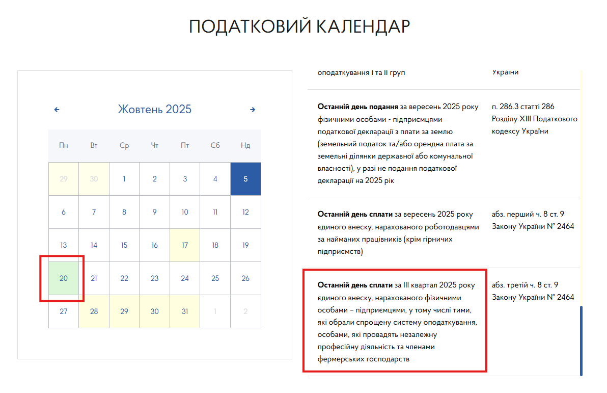Але за календарем ДПСУ останнім днем сплати ЄСВ ФОПами за ІІІ квартал є саме 20 жовтня 2025 року. Тобто центральний податковий орган керується встановленим правилом перенесення строків сплати на наступний банківський день.