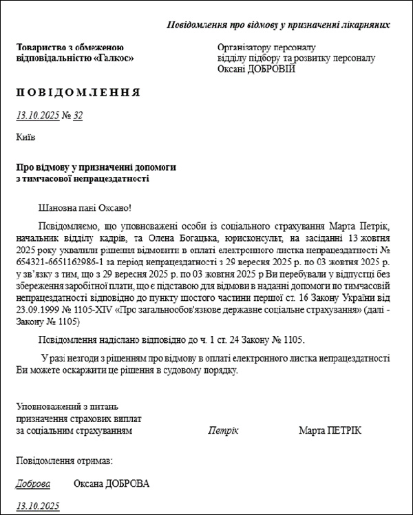 Рішення про відмову в оплаті лікарняного та повідомлення про відмову