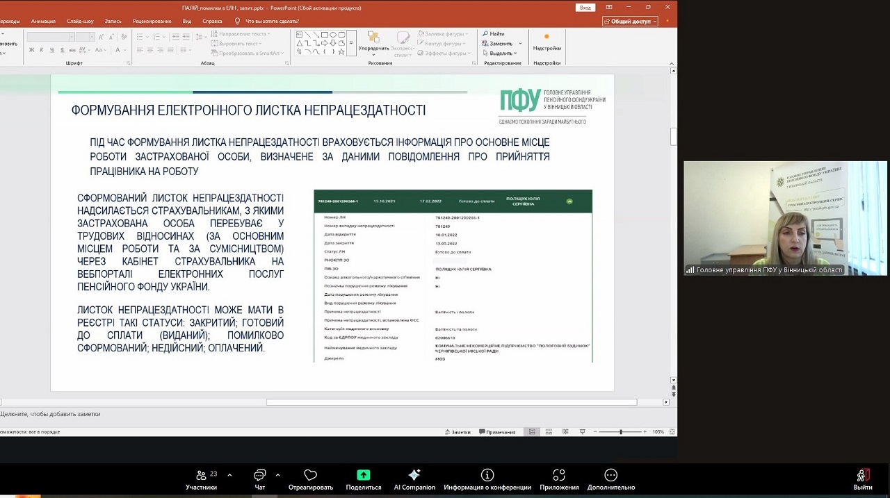 «Помилки в електронних листках непрацездатності. Запити на зміну страхувальника та створення копій листків непрацездатності правонаступникам» – тема вебінару, який відбувся у Головному управлінні Пенсійного фонду Вінниччини. Спікер заходу – Ірина Палій, начальник Відділу перевірки правильності розрахунку розміру страхових виплат у зв’язку з тимчасовою втратою працездатності.