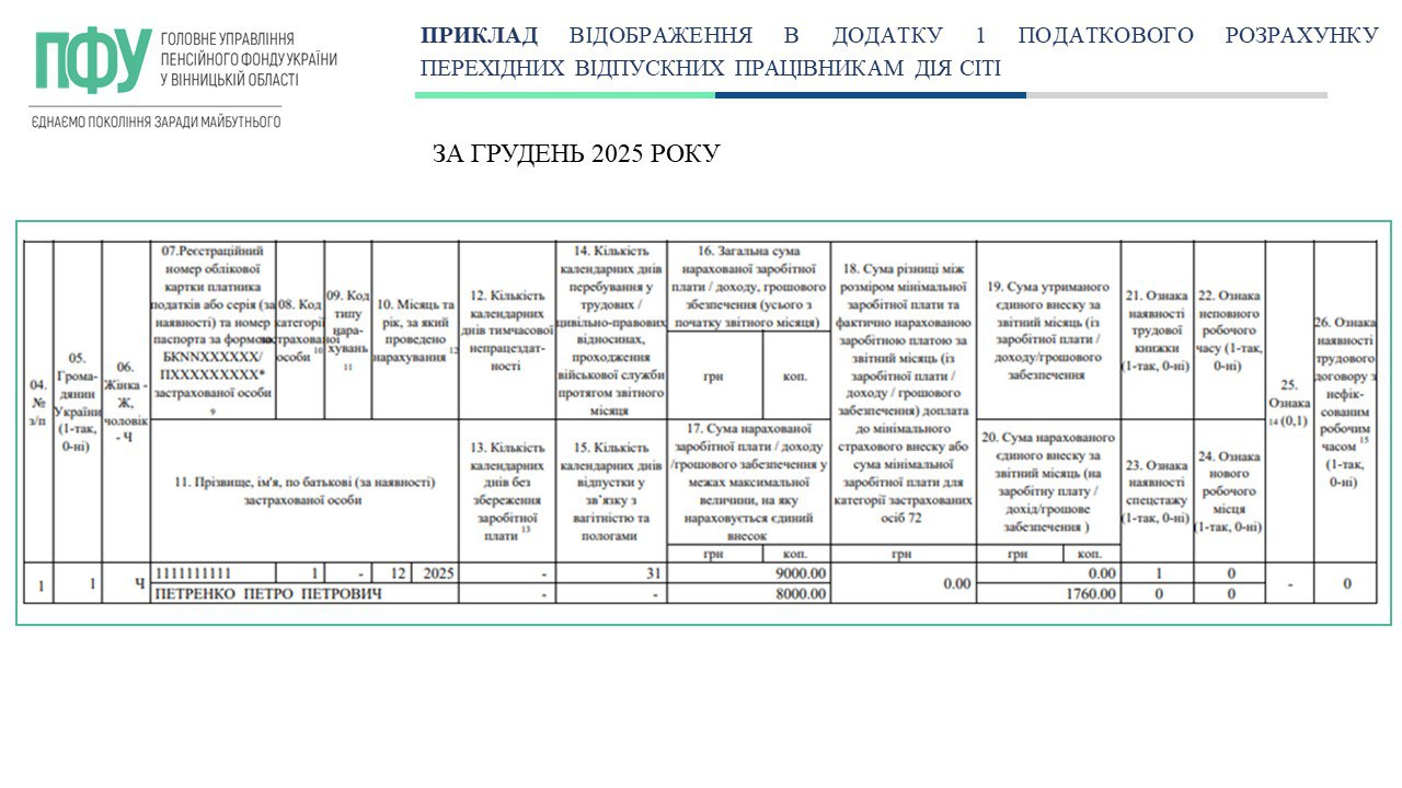 Приклад нарахування єдиного соціального внеску та відображення перехідних відпускних у Податковому розрахунку: