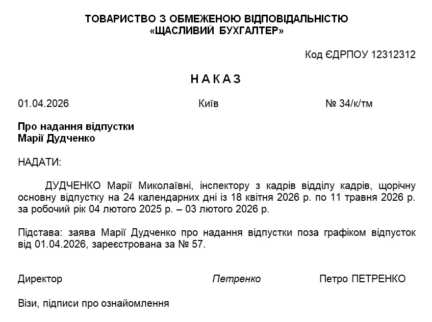 - Підстава для видання наказу (графік відпусток, заява, довідка-виклик навчального закладу тощо).