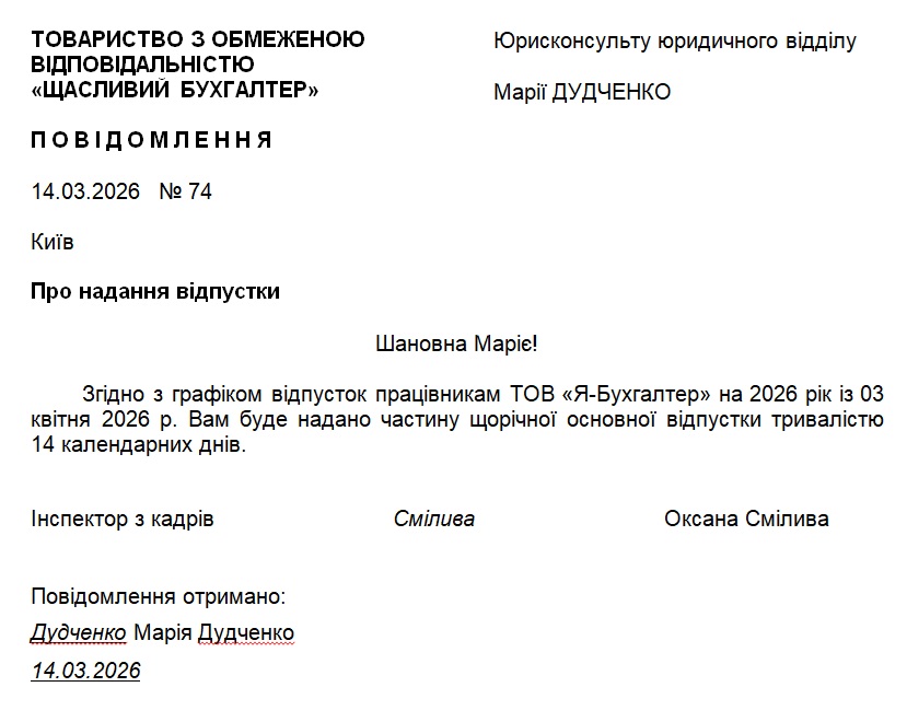Зверніть увагу, що форму повідомлення про дату початку відпустки законодавчо не встановлено. Отже, повідомлення має довільний характер.
