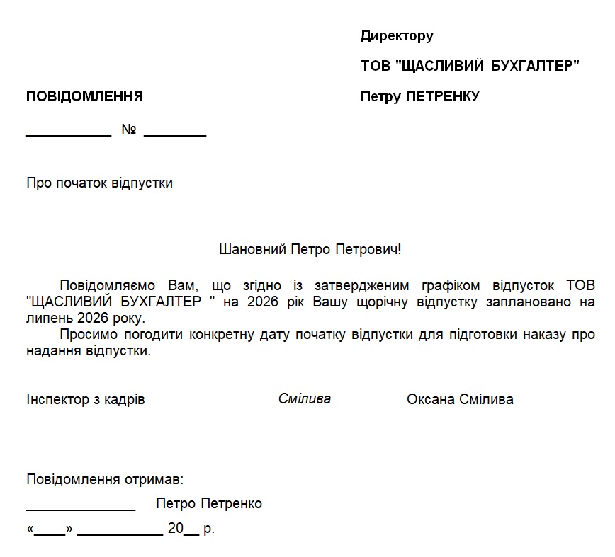 Зразок 2. Повідомлення директора про початок відпустки за графіком