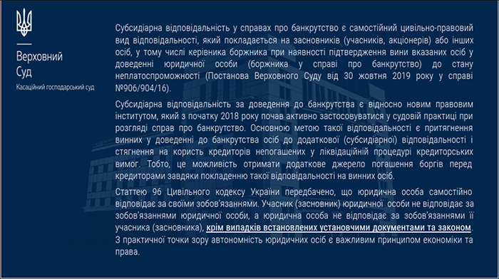 4) Субсидіарна відповідальність керівника/учасника юрособи – варто наголосити на таких висновках: