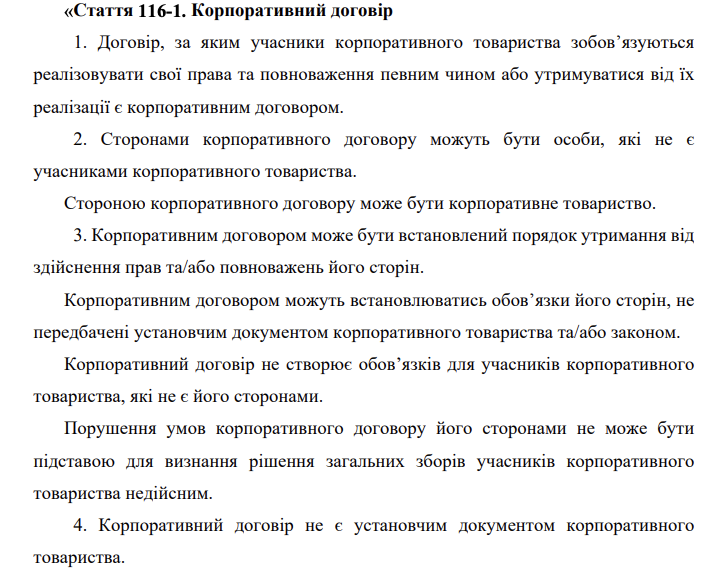 Документ передбачає доповнення ЦК України новою статтею 116-1 "Корпоративний договір". це договір, за яким учасники корпоративного товариства зобовʼязуютьсяреалізовувати свої права та повноваження певним чином або утримуватися від їх реалізації є корпоративним договором.