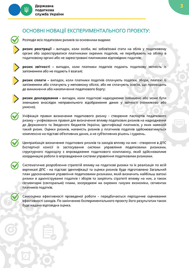 На виконання Національної стратегії доходів до 2030 року Кабінетом Міністрів України прийнято постанову про реалізацію експериментального проєкту щодо функціонування системи управління податковими ризиками (комплаєнс-ризиками) в Державній податковій службі.