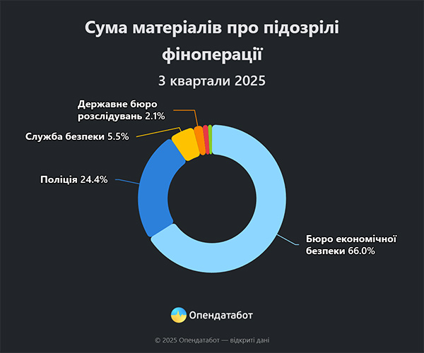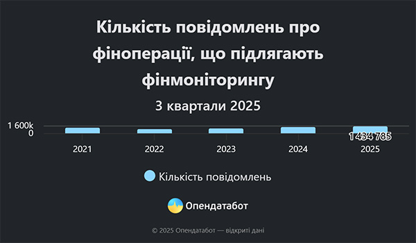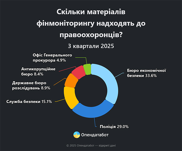 Опендатабот розповідає, що понад 1,4 млн повідомлень про фінансові операції, що підлягають фінмоніторингу, надійшло до Державної служби фінансового моніторингу за три квартали 2025 року. Це на 10% більше ніж за аналогічний період торік. Переважна більшість – 83% повідомлень – стосуються порогових операцій. Загалом 794 матеріали на суму 150,46 млрд грн було передано до правоохоронних органів для розслідування. Понад третину з них отримало Бюро економічної безпеки України.