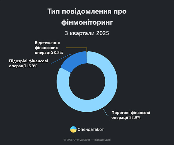 Переважна більшість повідомлень – 99% – від банків: 1,42 млн звітів. Небанківські установи передали ще майже 15 тисяч. Основна маса повідомлень стосується порогових фінансових операцій – понад 1,18 млн (83%). Підозрілих операцій значно менше – майже 243 тисяч (17%). Решта – це повідомлення, надіслані у відповідь на запити щодо відстеження, а також комбіновані звіти, що одночасно стосуються і порогових, і підозрілих операцій.