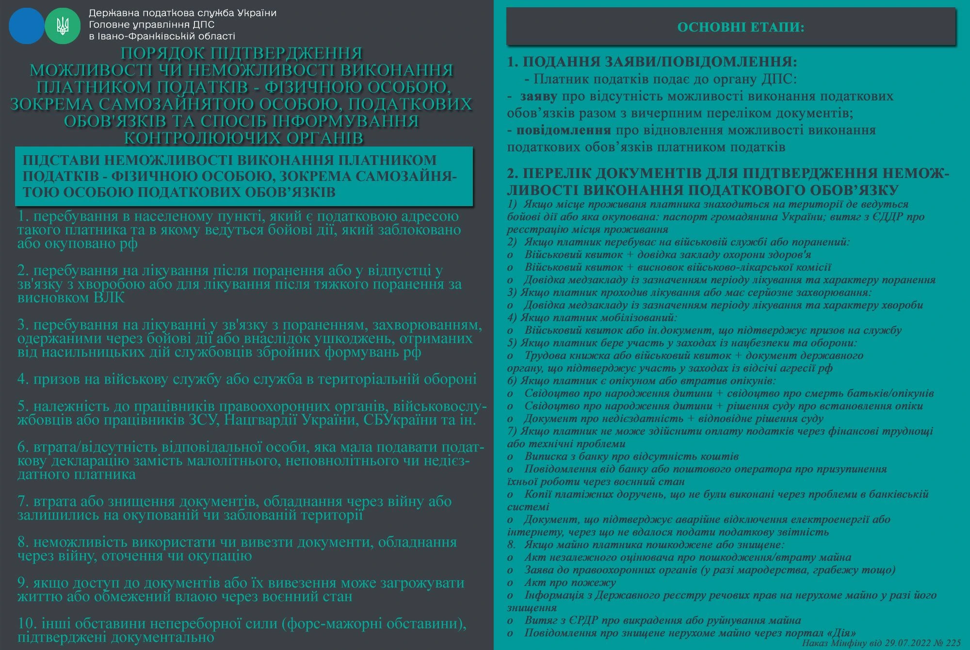Слід зазначити, що дія Порядку підтвердження можливості чи неможливості виконання платником податків обов’язків, визначених у пп. 69.1 підрозділу 10 розділу XX «Перехідні положення» ПКУ, та переліків документів на підтвердження» (далі – Порядок №225) поширюється на платників податків – фізичних осіб – резидентів України, зокрема самозайнятих осіб, юридичних осіб (резидентів і нерезидентів України) та їх відокремлені підрозділи, які мають, одержують (передають) об’єкти оподаткування або провадять діяльність (операції), що є об’єктом оподаткування, та на яких покладено обов’язок зі сплати податків та зборів, подання звітності, виконання інших обов’язків, передбачених Податковим кодексом України, або іншим законодавством, контроль за дотриманням якого покладено на контролюючі органи.