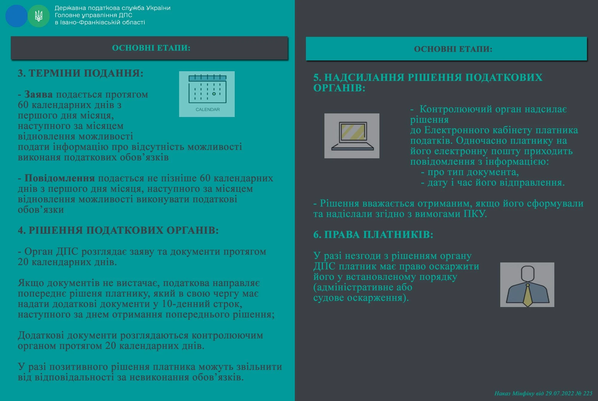 Нагадуємо: платники податків, у тому числі щодо своєї філії, представництва, відокремленого чи іншого структурного підрозділу, щодо яких контролюючим органом прийнято рішення про неможливість своєчасного виконання платником податків податкового обов’язку, та у яких відновилася можливість виконувати свої податкові обов’язки, зобов’язані повідомити, контролюючий орган про відновлення можливості виконання платником податків, у тому числі щодо своєї філії, представництва, відокремленого чи іншого структурного підрозділу, податкового обов’язку не пізніше 60 календарних днів з першого дня місяця, наступного за місяцем відновлення таких можливостей платників податків, шляхом подання повідомлення довільної форми.