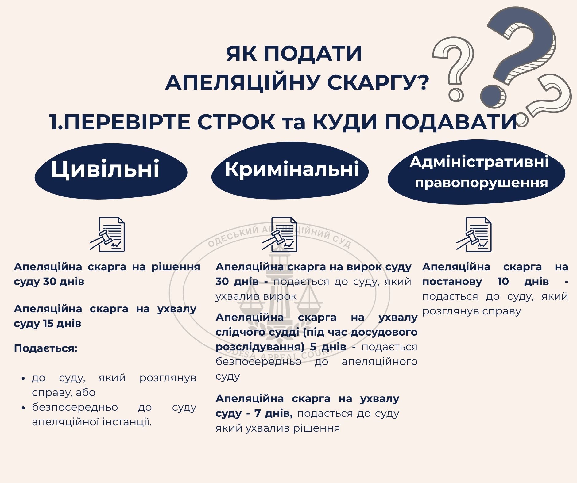У інфографіці зібрано основну інформацію для учасників судового процесу. Зокрема, прописані строки подання апеляційної скарги у цивільних, кримінальних справах та справах про адміністративні правопорушення
