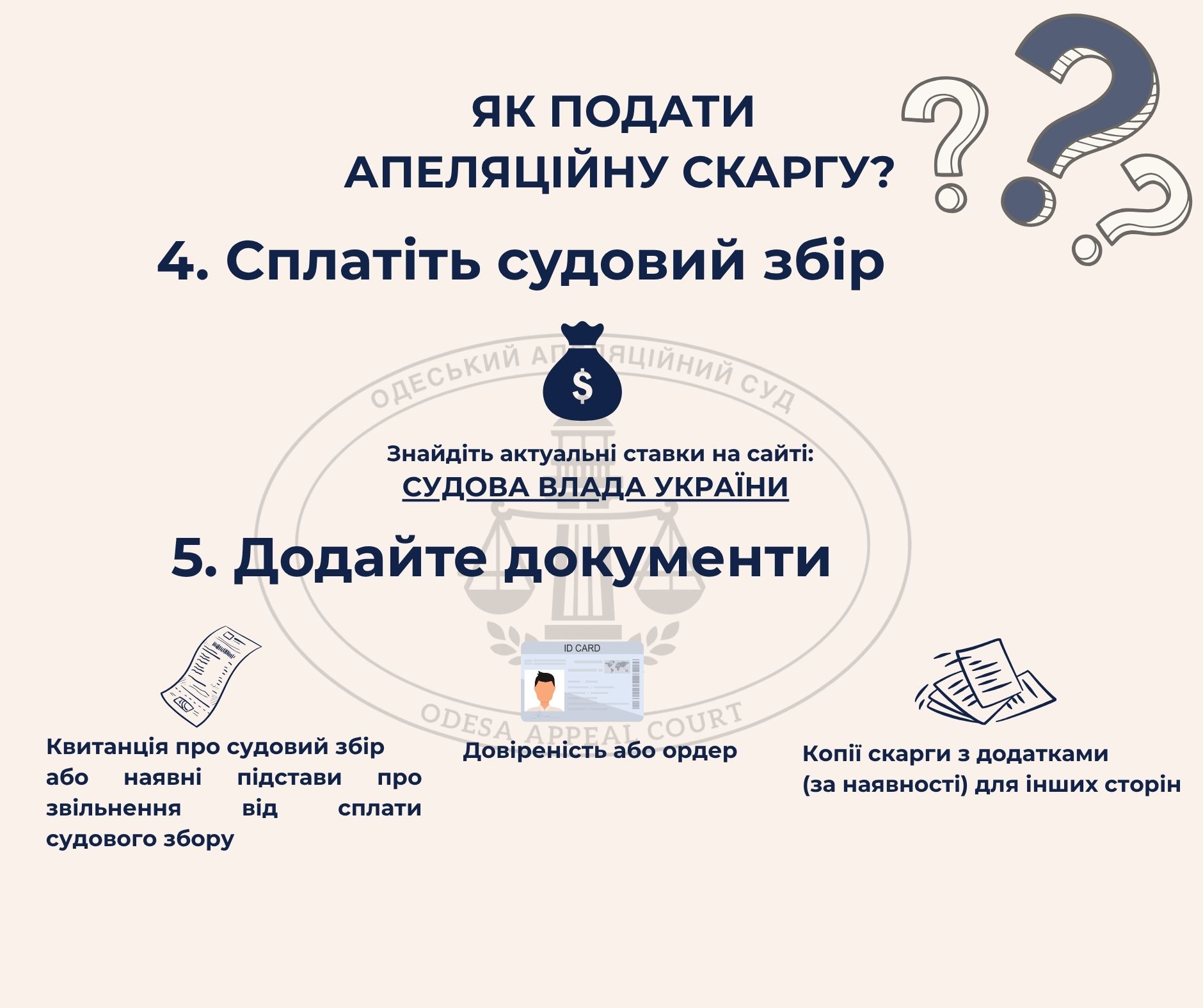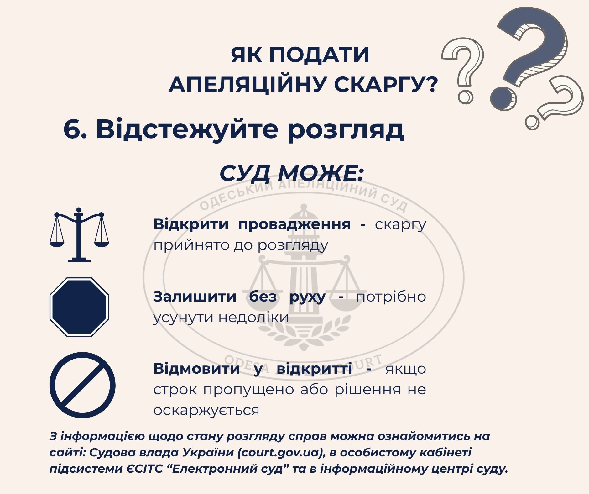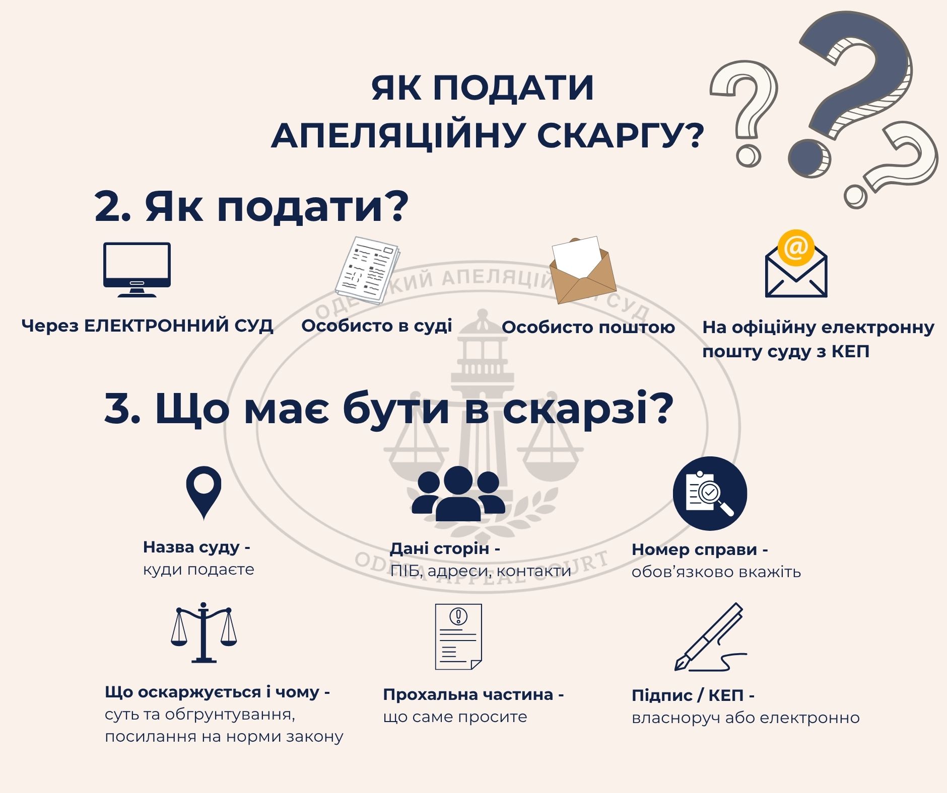 Судова влада України повідомляє, що з метою просвітницької діяльності Одеський апеляційний суд підготував інфографіку, яка допоможе громадянам краще зрозуміти порядок подання апеляційної скарги.