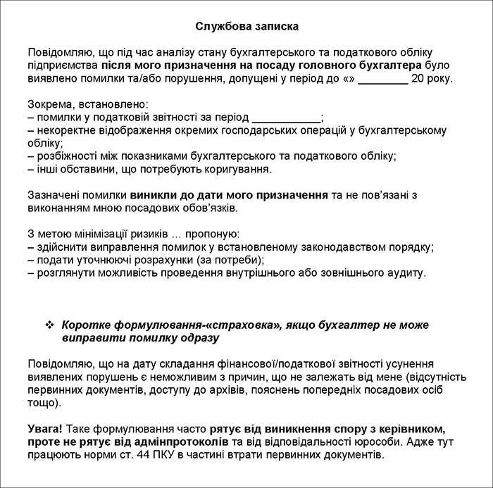 2. Повідомити керівника про виявлені невідповідності та можливі наслідки (штрафи, пеня). Тут слід враховувати суттєвість помилок. Про дрібні помилки, які швидко можна виправити за встановленим на підприємстві порядком, керівника можна і не повідомляти (якщо він не буде задіяний у виправленні таких помилок). Про суттєві помилки, про помилки, для виправлення яких знадобиться допомога керівника, про помилки, щодо яких потрібне його рішення (як правило, в разі відсутності наказу про облікову політику на підприємстві) – складається службова записка.