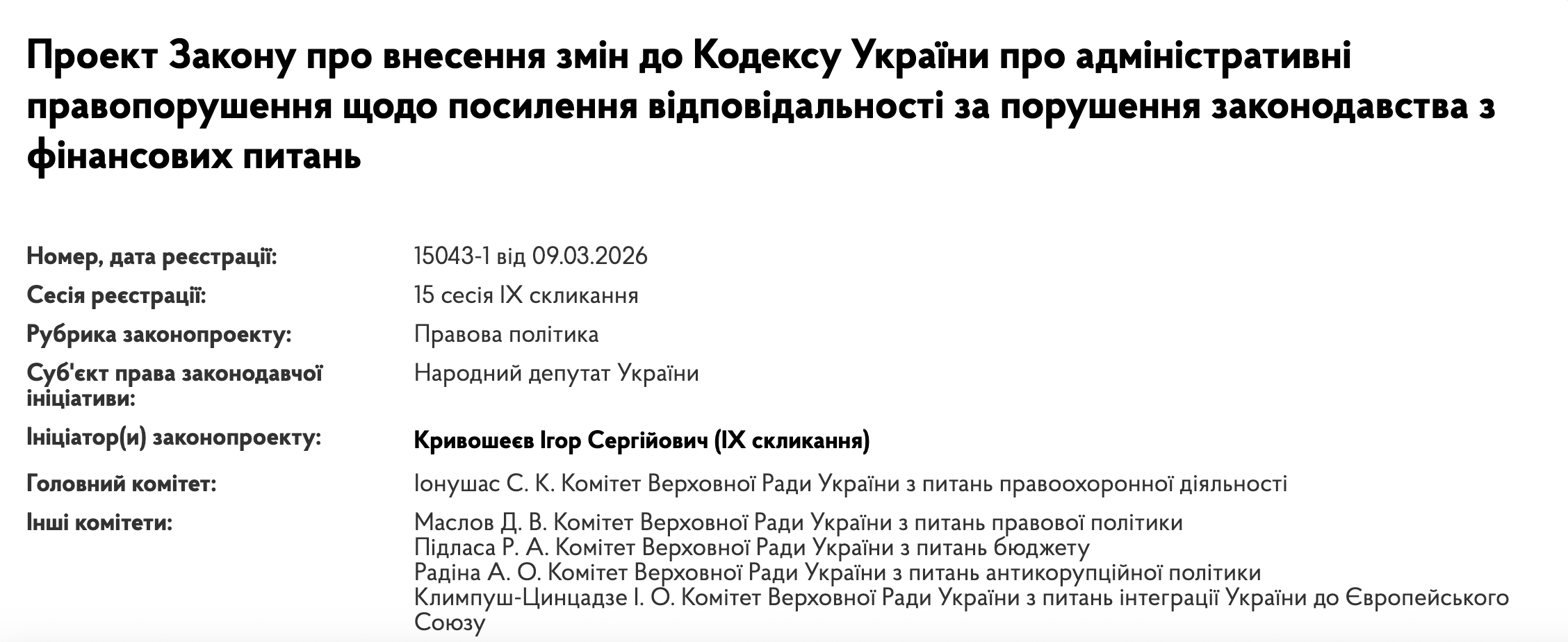 Ми вже розповідали, що 24 лютого 2026 року у ВРУ зареєстровано урядовий законопроєкт №15043 "Про внесення змін до Кодексу України про адміністративні правопорушення щодо посилення відповідальності за порушення законодавства з фінансових питань". Ним штрафи за фінансові порушення планують суттєво підвищити: для першого порушення — зі 136–255 грн до 850–1190 грн, для повторного — зі 170–340 грн до 1020–1360 грн