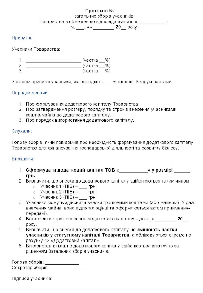 «Внесення коштів або майна до додаткового капіталу здійснюється на підставі рішення Загальних зборів учасників Товариства, яке приймається більшістю голосів. Порядок, розмір і строки внесення додаткового капіталу визначаються окремим протоколом Загальних зборів».