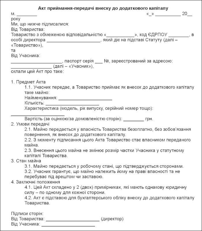 Зразок 2. Акт приймання внесків до додаткового капіталу (Завантажити)