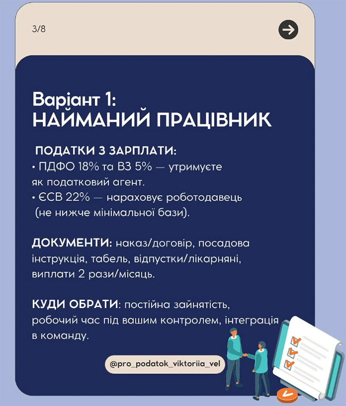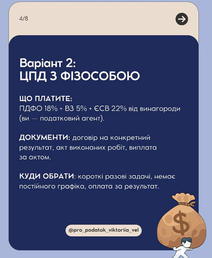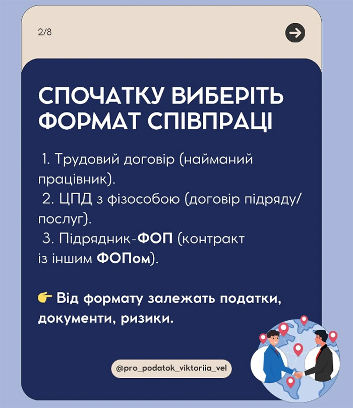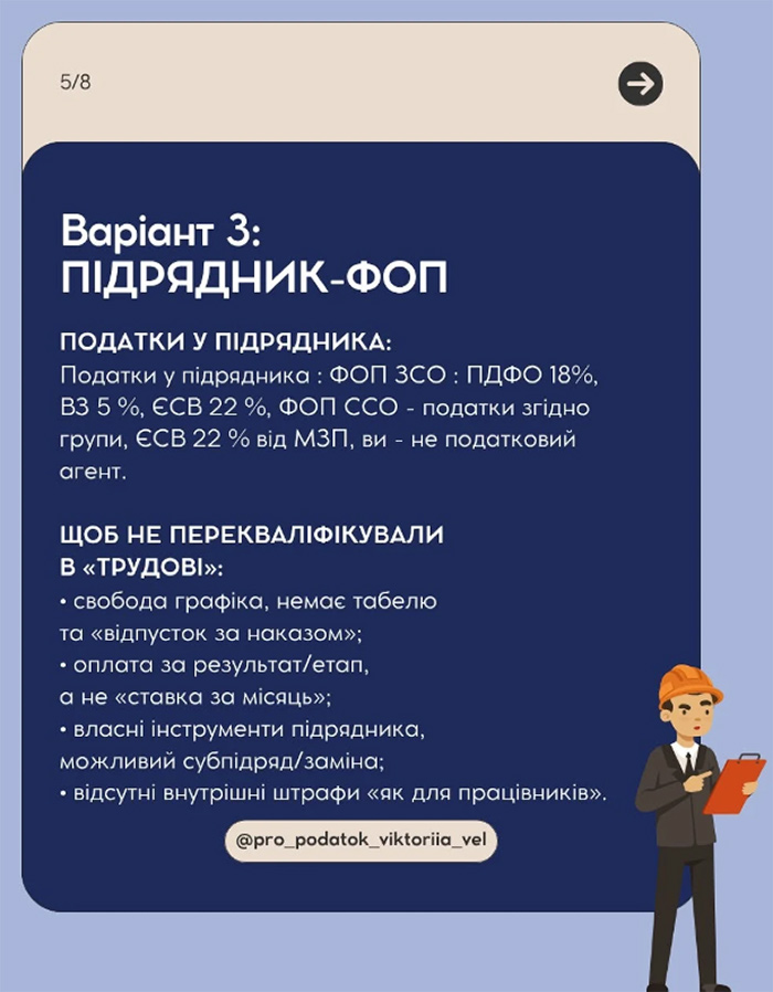 - коли обирати офіційне працевлаштування через найм, коли достатньо цивільно-правового договору з фізичною особою, а коли вигідніше працювати з підрядником-ФОПом;