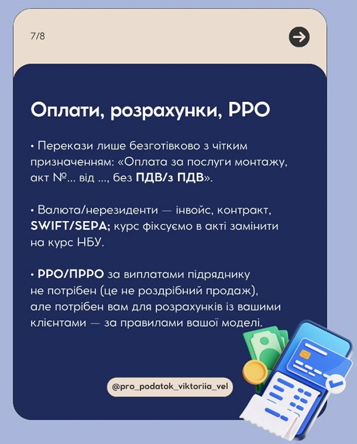 Перекази лише безготівково з чітким призначенням: «Оплата за послуги монтажу, акт Nº... від ..., без ПДВ/з ПДВ».