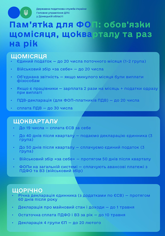 Донецькі податківці зауважили, що ФОПам слід не пропускати граничні терміни сплати податків і подання звітності, щоб уникнути штрафних санкцій. В інфографіці вказано, які саме обов’язки має підприємець та коли їх потрібно виконувати.