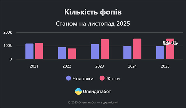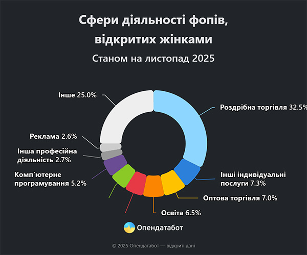 Опендатабот розповідає, що понад 153 тисячі нових ФОПів відкрили жінки за 10 місяців 2025 року в Україні за даними Єдиного державного реєстру. Це 61% від загальної кількості новостворених ФОПів у 2025 році. Найбільше бізнесів зареєстрували цьогоріч жінки у столиці, на Дніпропетровщині та Київщині. Серед сфер жіночого підприємництва лідирують торгівля, освіта та краса.