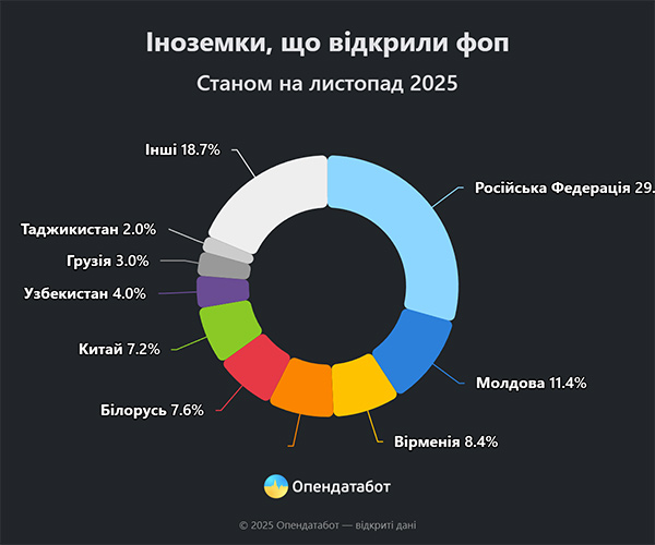 Варто зазначити, що іноземки також активно реєструють ФОПи в Україні. Найбільше ФОПів зареєстрували громадянки Росії (175), Молдови (68), Вірменії (50) і Азербайджану (49).