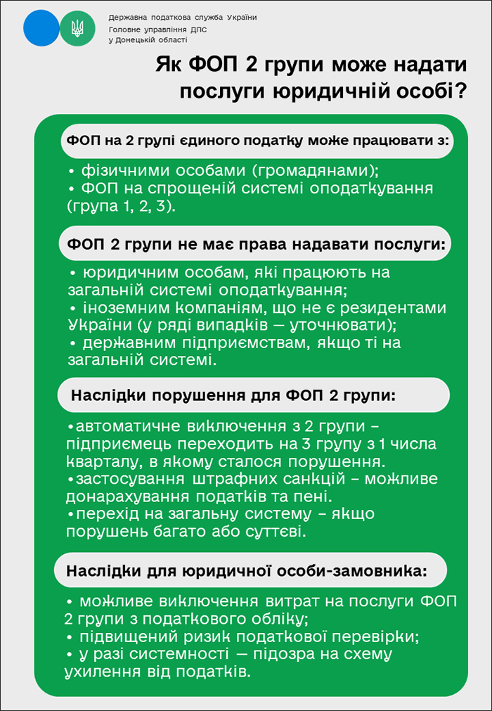 Податківці наголосили, що податкове законодавство встановлює суттєві обмеження щодо потенційних контрагентів для ФОПів, які перебувають на єдиному податку. Зокрема, вони можуть надавати послуги тільки юрособам-«єдинникам»